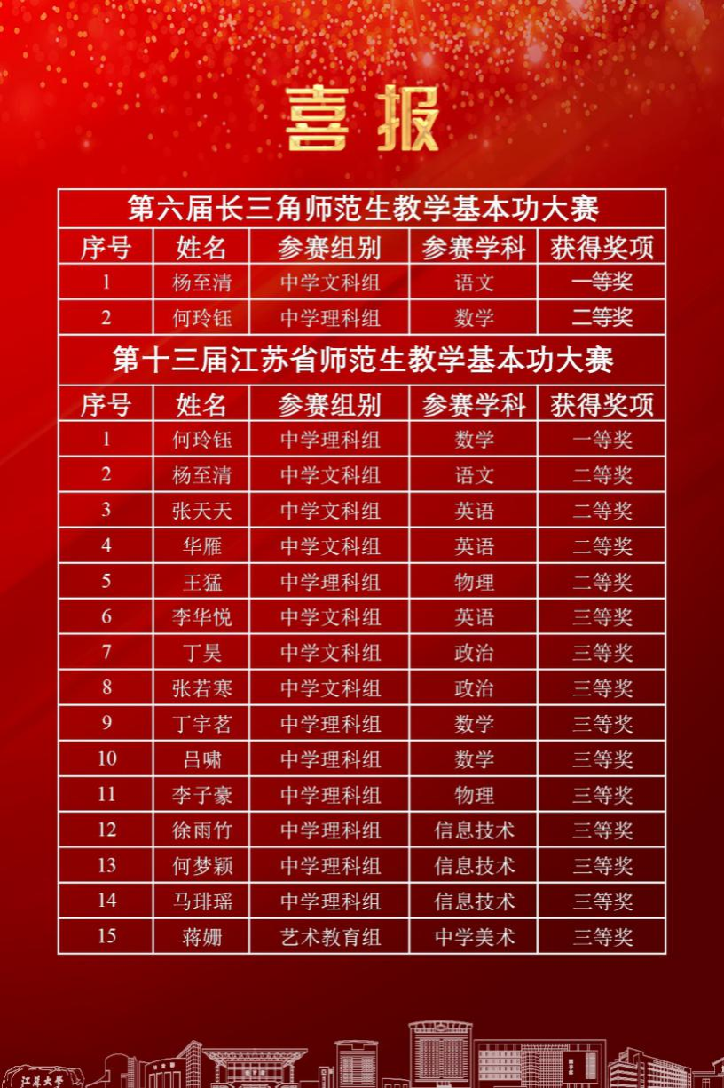 第六届长三角师范生教学基本功大赛上,澳门银河娱乐城师范生杨至清荣获中学语文组一等奖,何玲钰荣获中学数学组二等奖。第十三届江苏省师范生教学基本功大赛,澳门银河娱乐城师范生15人获奖。具体如下: