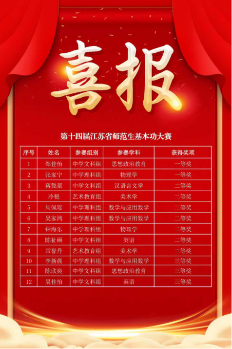 近日,第十四届江苏省师范生教学基本功大赛发布比赛结果,澳门银河娱乐城学生邹佳怡、张家宁荣获一等奖,蒋懿蕾等六名同学荣获二等奖。