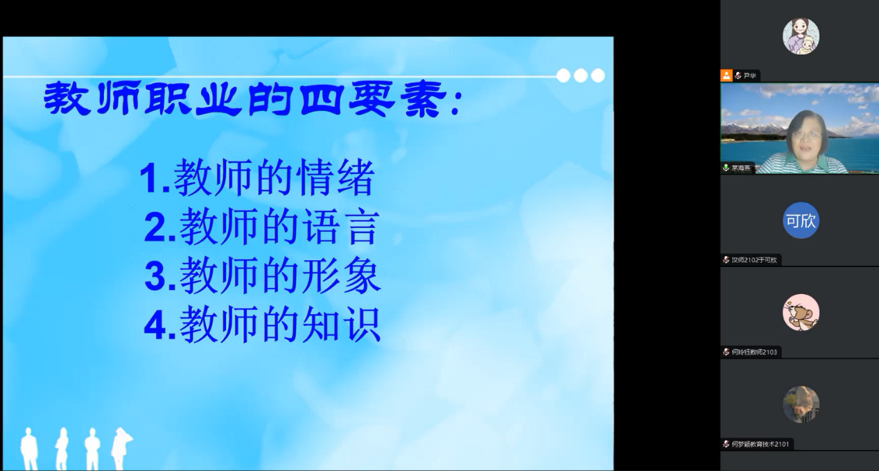训练安排等方面进行交流分享。提问环节,老师们一一解答同学们的疑惑,鼓励同学们抓住暑期在家时间进行教学技能的练习,互相提携,共同成长。