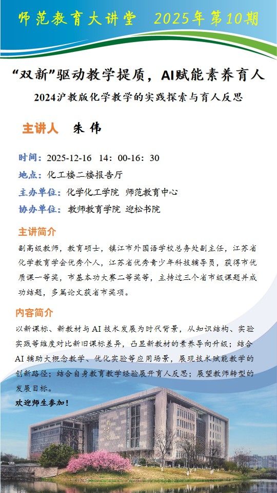 上一条:澳门银河娱乐城 与镇江高等职业技术澳门银河娱乐城 签订家校社协同育人“教联体”共建单位合作框架协议 下一条:【师范教育大讲堂】2025年第9期 追问:教怎样的化学?
