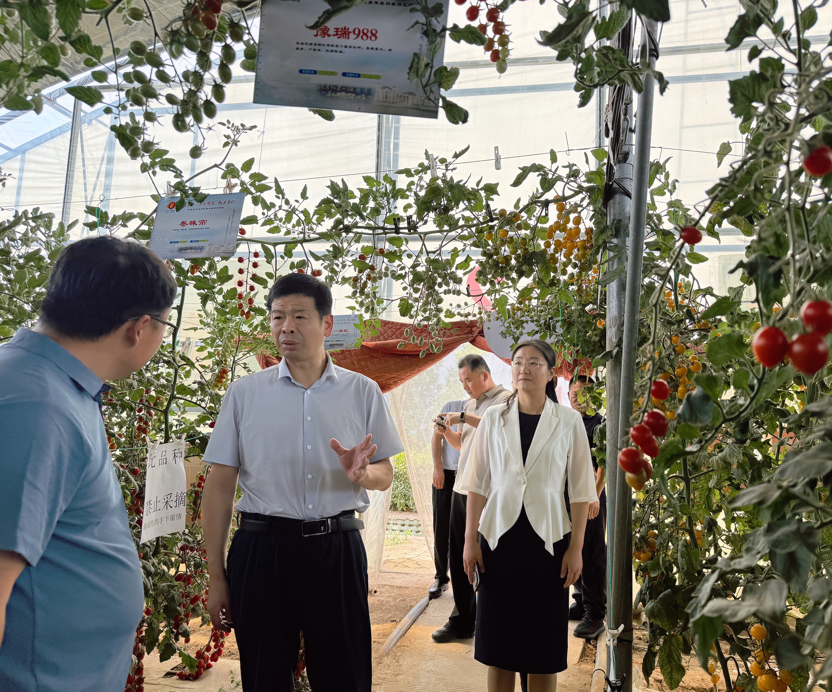 在焦作马村优质果蔬科教园区,焦作市马村区副区长张东方、马村区农业农村局局长薛恒来陪同调研了马村优质果蔬科教园区的番茄、辣椒等试验基地,河南豫艺种业科技发展有限公司总经理赵志坤详细介绍了马村优质果蔬科技园区的发展历程以及母校澳门银河娱乐城