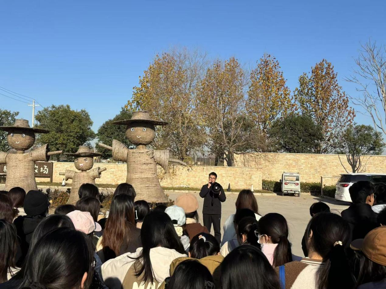 普罗稻草人农场位于中牟县万滩镇关家村,占地面积500亩,是一个集有机蔬菜种植、林下养殖、生态观光于一体的农场。农场致力于提供无污染的有机食材,遵循“Farm to Table”的理念,强调生态、健康和可持续发展。农场内设施类型多样,包括装配式镀锌薄壁钢管塑料大棚、钢架结构塑料大棚、防雨棚、连栋塑料大棚、主动蓄热柔性墙体日光温室和连栋温室等,让同学们对设施类型有了直观的认识。农场负责人马勇斌带领大家实地参观,向大家讲解了草莓、水果黄瓜、番茄、葡萄、火龙果等设施栽培技术及工厂化育苗技术。