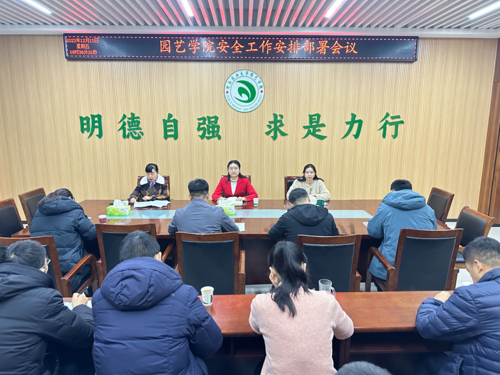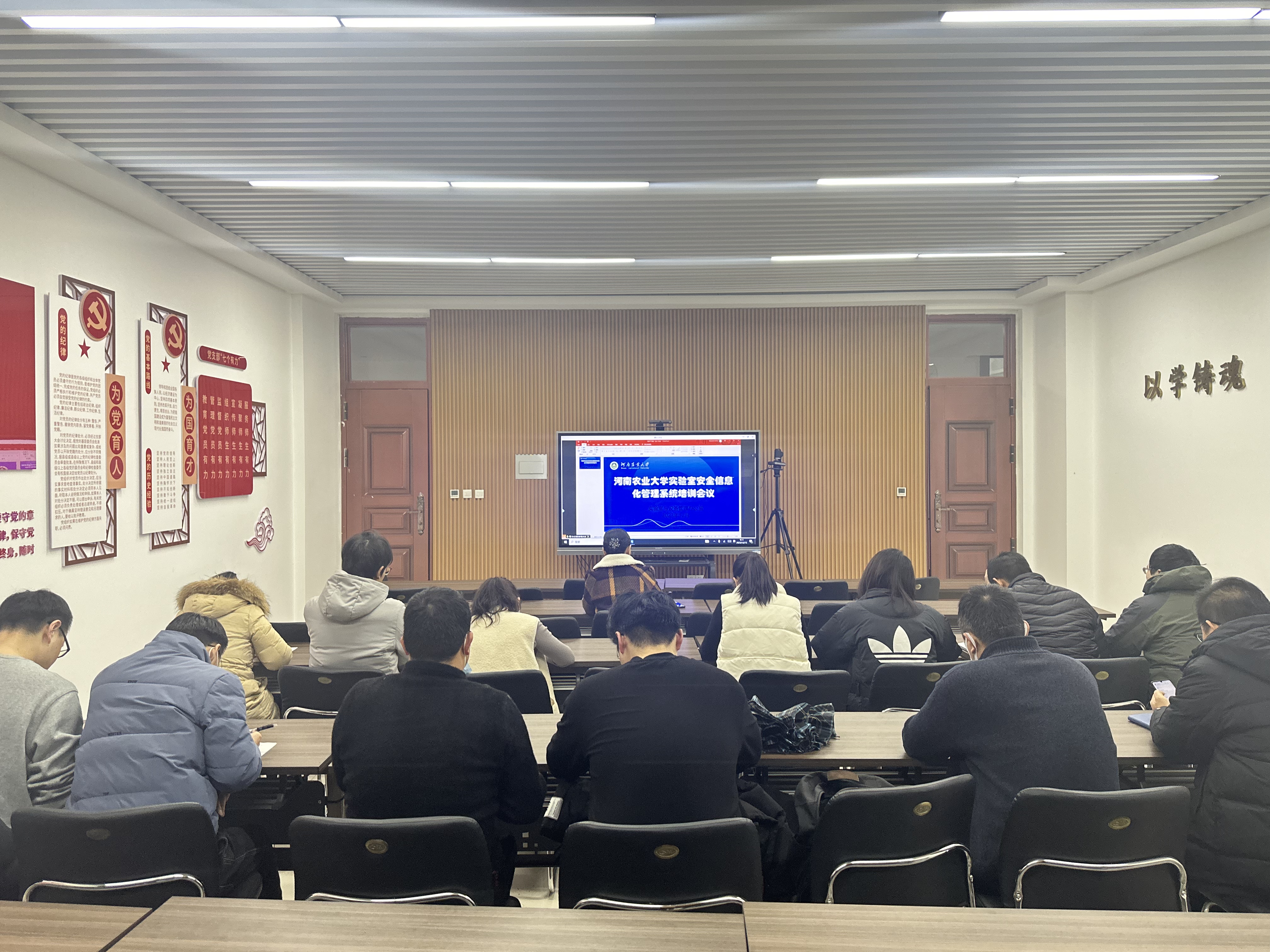 于12月15日在龙子湖校区第二实验楼北215召开安全工作安排部署会议,并在北211多媒体会议室通过视频的方式集中进行“实验室安全信息化管理系统培训”。院班子全体成员、全体中层干部以及各系室实验室负责人分别参加了会议和培训,会议由院党委书记秦素玲主持。