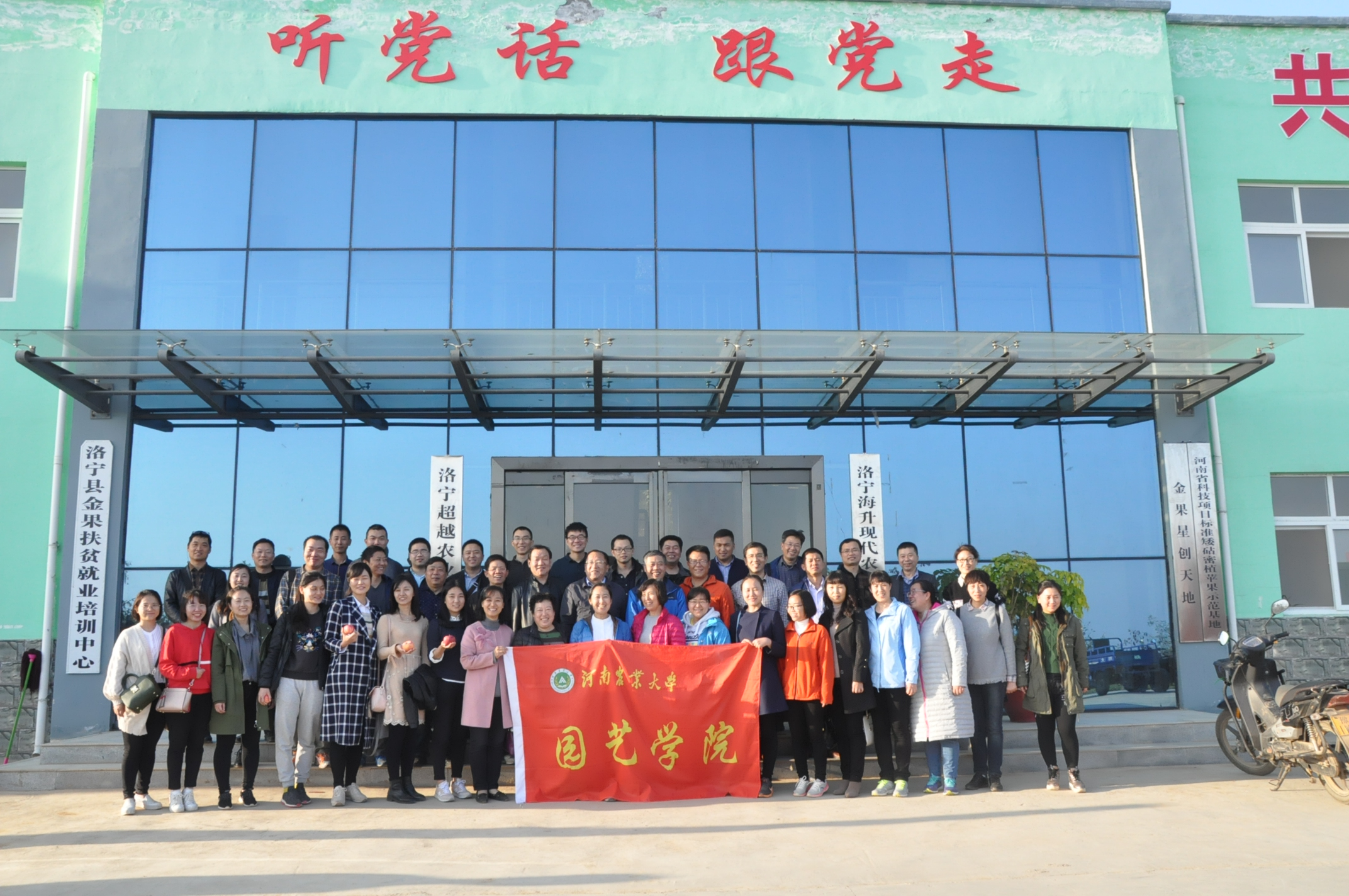 全体教师赴洛宁上戈海升现代苹果矮化密植示范园集体备课,现场观摩苹果矮砧集约高效栽培模式。