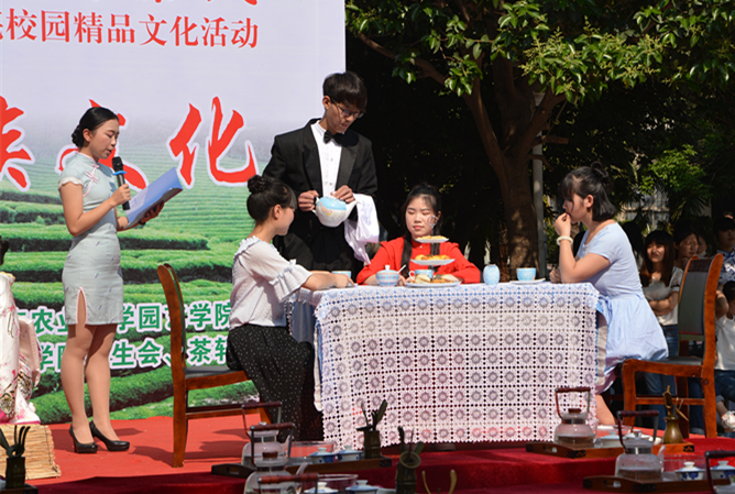 的学子精心展示的日本茶道和英国下午茶情景展示,使大家身临其境体味到不同国家的饮茶文化;21名茶仙子的盖碗表演,动作优雅、整齐划一,娴熟的技艺引人入胜;南北区域茶的观赏对比,沏茶表演和演说相结合生动的对潮汕紫砂、福建功夫、台湾冻顶乌龙陶壶进行了类比;各具特色的民族舞蹈给现场观众带来独特的茶文化展示,各民族不同的吃茶饮茶方式令人耳目一新,体现了中国茶文化的博大精深。