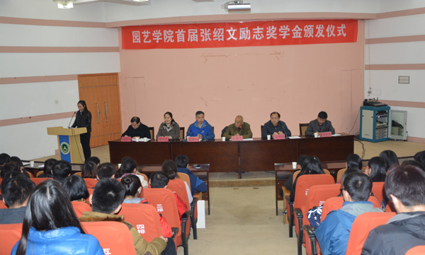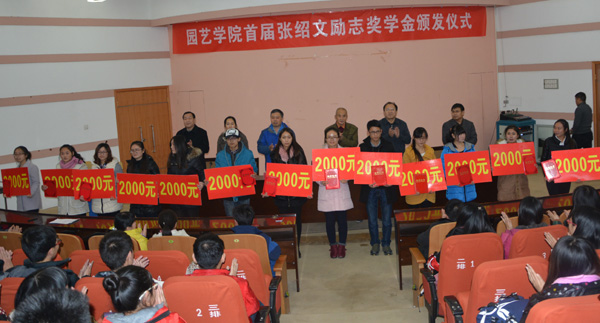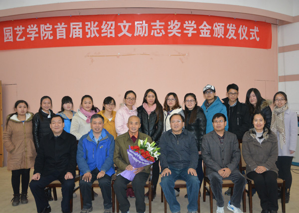 设立此项奖学金的目的,对捐资的豫艺种业科技发展有限公司及广大校友表示感谢,向获得首届“张绍文励志奖学金”的13名同学们表示祝贺。颁奖结束,园艺2012级2班郑志华同学代表获奖学生发言,表示牢记使命,投身园艺事业,勇于担当,回馈社会。