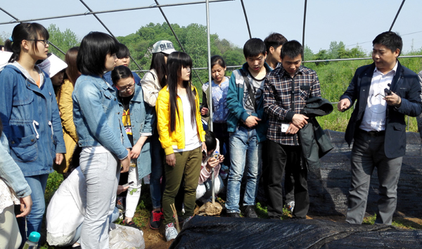 参观信阳农业局震雷山茶叶试验站,杨站长为同学们传授茶叶幼苗扦插技术