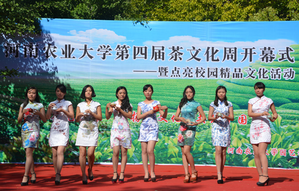 随着校党委书记程传兴宣布第四届茶文化周开幕后,茶学学子开始精彩的演出,娇美的茶学佳丽们在《茶山情歌》的伴奏下,用优美、活泼的舞姿带领大家回到秀丽的茶山秀水,演绎着采茶忙的喜悦;23名茶仙子的盖碗表演,优雅的气质,娴熟的技艺,让现场观众感受到了茶文化的魅力;一曲《中国茶》唱出了茶文化的的精华,洗去了浮华,让我们在时光中懂得了沉淀,在宁静中学会放下;技艺精湛的长嘴壶茶艺表演,扣人心弦,引人入胜,赢得观众的阵阵掌声;主题茶艺表演再现了唐宋明清四个朝代茶文化的发展历程,展现了中国茶文化的源远流长;同学们将中国传统文化和专业特色结合的《书写筝舞》古今文化交织,结构紧凑,更是把传统文化精髓创新展示;香茗T台秀压轴登台,学子手捧香茗,向观众们展示不同的泡茶器具和茶叶文化。