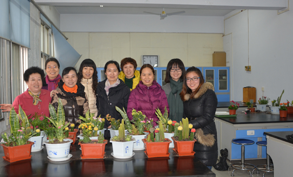 中心实验室主任张惠梅详细介绍了盆景原材料种类、生长特性以及组合的原则等。接着女教师们展开丰富的想象,开始动手组合盆景,五颜六色的长寿花、娇羞可爱的石竹、亭亭玉立的袖珍椰子以及金妞、万重山、观音莲等各种不同种类的花卉,在她们的巧手中,透过不同的花艺方式呈现,不一会儿就呈现出一盆盆花枝招展的创意盆栽。整个活动充满了欢声笑语。最后,大家将各自的作品一一展示并合影留念。