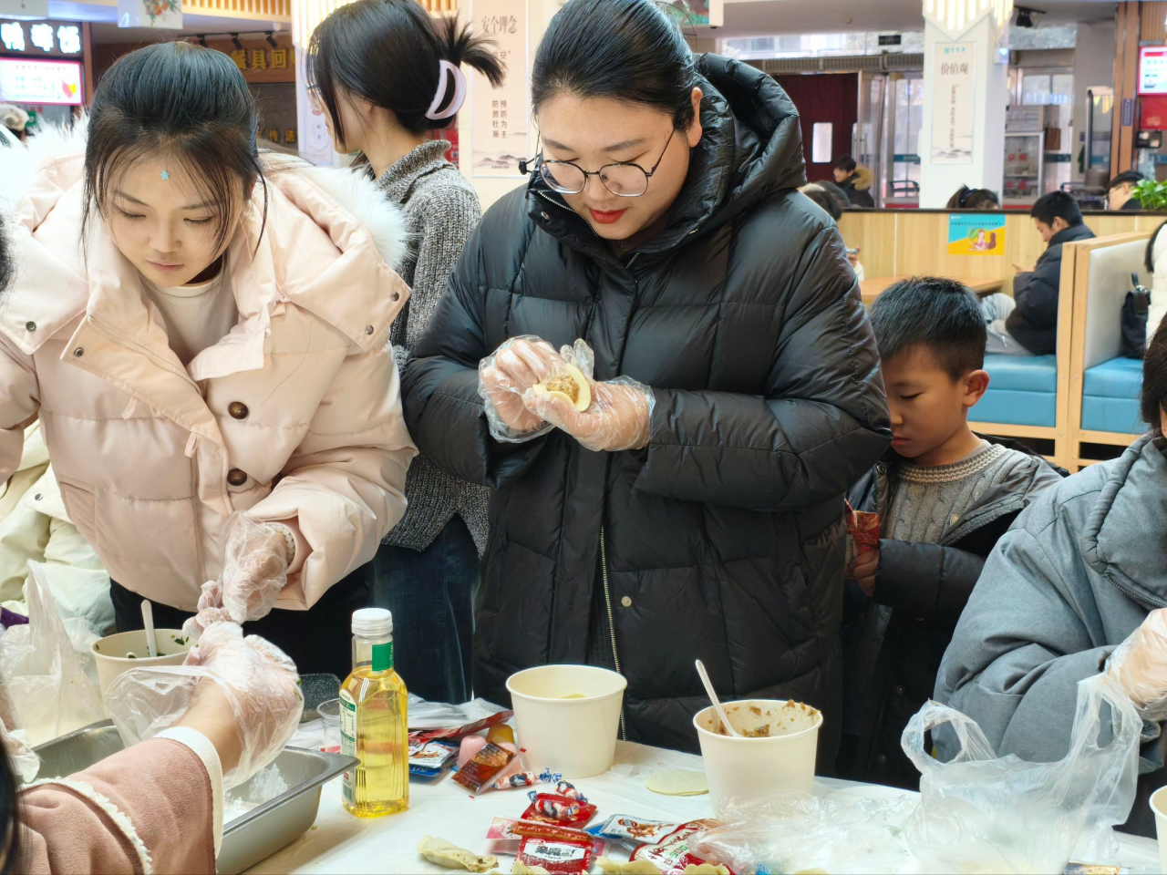 活动现场暖意翻涌,处处都是热闹的气息。同学们分工有序、配合无间,擀皮的手起落均匀,包馅的动作利落精巧,捏褶的手法各有巧思,指尖的动静里,一个个形态鲜活的饺子接连成型,整个食堂里都漫着“家” 的暖香,裹着节日的欢喜。包饺子的间隙里,大家围在一起聊起家乡的冬至风俗,你说北方的冬至要就着蒜吃饺子,我说南方会煮上一碗汤圆;有人分享捏出元宝饺的小技巧,有人学着把饺子捏成小巧的麦穗形状,还有人包出各种新奇馅儿的饺子和大家分享彩蛋,在一来一往的交流里,彼此的距离越拉越近,友谊也在面粉的香气里慢慢升温。