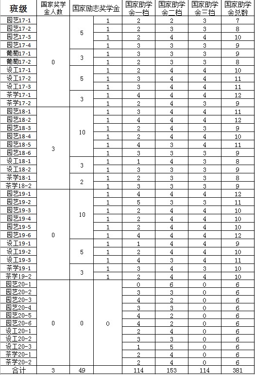 国家奖学金3人;国家励志奖学金49人;国家助学金381人。