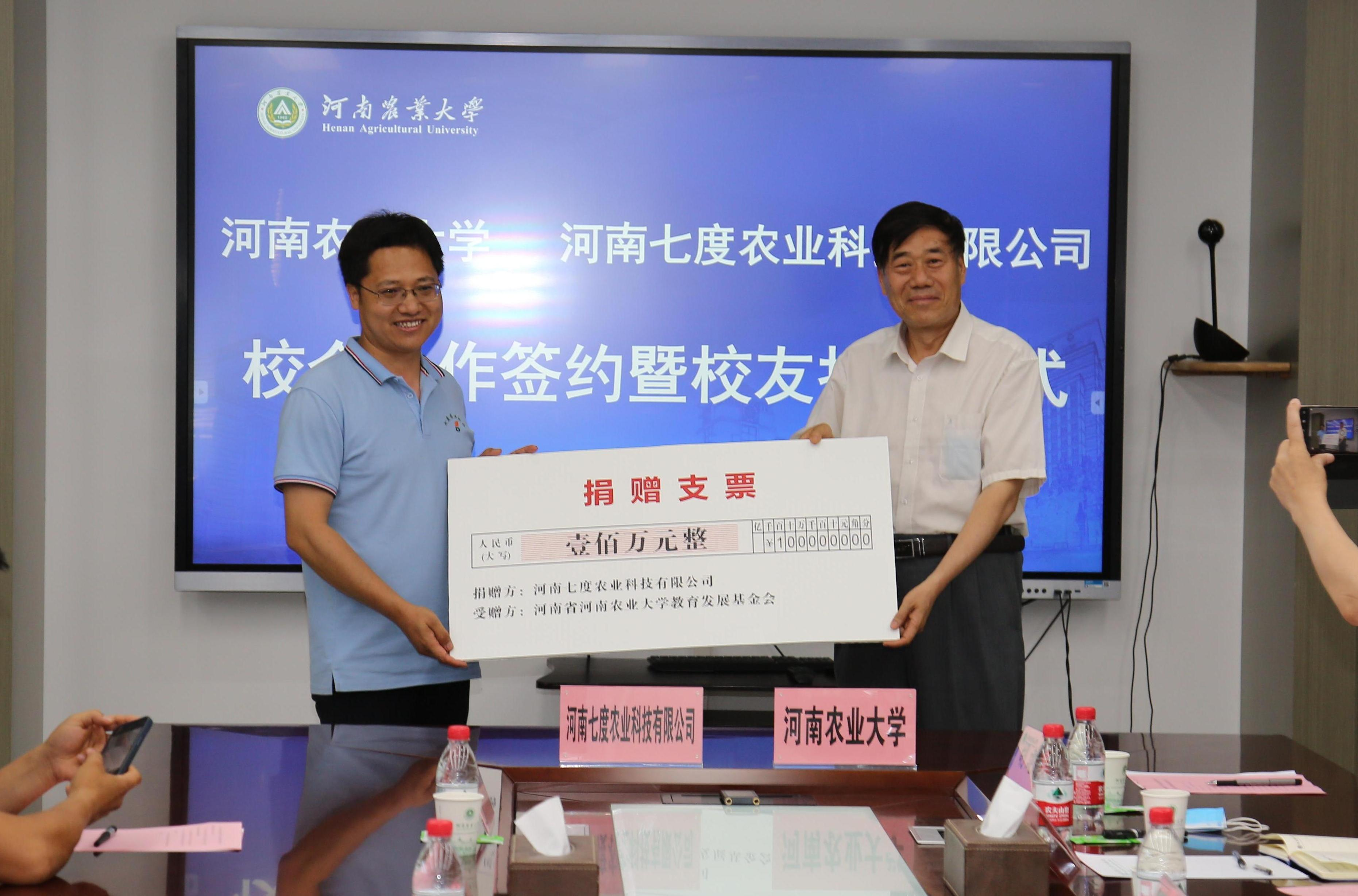 与河南七度农业科技有限公司校企合作签约暨校友捐赠仪式在龙子湖校区举行。副校长康相涛、河南七度农业科技有限公司董事长、澳门银河娱乐城