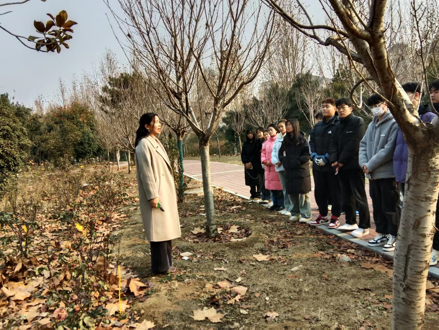 师生而言,更为大家提供了操作和实践的机会。随后,蒋丽微老师结合实际操作让大家直观地学习了月季修剪的具体步骤,并强调同学们在冬季修剪月季时要注意观察枝条分布,遵循“去老留新、去弱留强”的原则,要根据月季品种的生长、开花特性,确保主枝留量合理、分布均匀,做到剪口平整光滑,留好外向芽,以便逐步扩大树冠,增加花量。在老师的指导下,同学们从一开始不能灵活使用枝剪刀清理杂草、修剪枯枝,到能够熟练地使用工具进行修剪。大约两个小时的时间里,同学们分头行动,在老师的指导下认识不同品种的月季植株,理清生长矛盾的枝条,兼顾不留枯枝病叶与植株美观生长的原则,握紧各自的修枝剪亲手修剪花枝。在大家的共同努力下,月季植株“焕然一新”,为来年的茁壮生长奠定了基础,大家也用劳动和努力诠释着奋斗的意义。