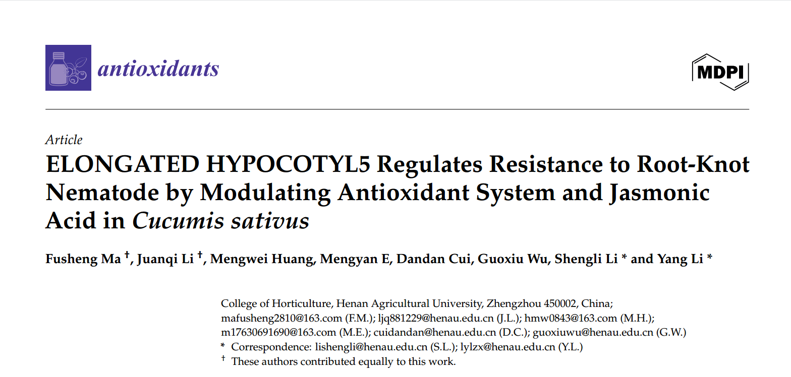 蔬菜种苗发育调控及工厂化繁育团队在Antioxidants发表了题为“ELONGATED HYPOCOTYL5 Regulates Resistance to Root-Knot Nematode by Modulating Antioxidant System and Jasmonic Acid in Cucumis sativus”的研究论文。该研究首次报道了黄瓜转录因子CsHY5介导的南方根结线虫侵染黄瓜的调控机制,为阐明植物与根结线虫的互作机制提供了新的途径和思路。
