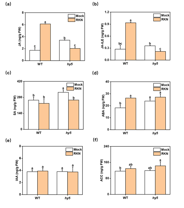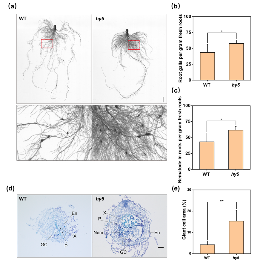 此研究通过CRISPR/Cas9技术构建CsHY5突变体并进行侵染后发现,与野生型黄瓜相比,突变体根系入侵的线虫数量增加,根结数显著增多,且线虫发育至雌性阶段的速度更快,产卵量提升。而且野生型黄瓜在感染线虫后,叶片中的过氧化物酶(POD)和抗坏血酸过氧化物酶(APX)活性显著升高,而突变体中这些酶的活性无明显变化甚至降低。野生型叶中茉莉酸(JA)、茉莉酸-异亮氨酸(JA-Ile)和脱落酸(ABA)含量显著增加,其中JA的变化最为突出,而突变体中这些激素的增加消失。