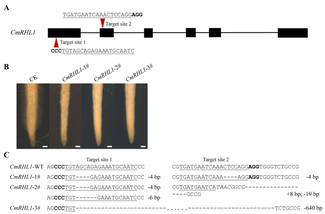 CmRHL1基因进行敲除,发现该基因被敲除后甜瓜的根毛不能形成。