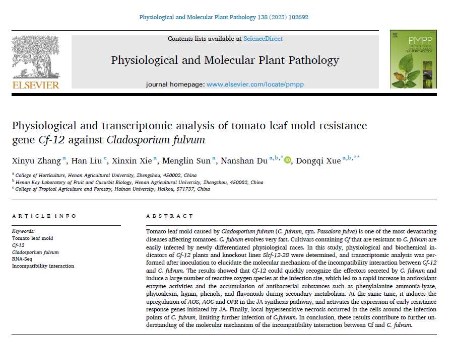 茄科抗病抗逆种质创新研究团队在园艺学领域期刊《Physiological and Molecular Plant Pathology》发表了题为“Physiological and transcriptomic analysis of tomato leaf mold resistance gene Cf-12 against Cladosporium fulvum” 的研究论文。研究对Cf-12及其敲除植株Slcf-12-28 在抗性生理、生化及转录水平上的差异进行了表征,研究结果丰富了Cfs基因响应叶霉病侵染的抗性生理。