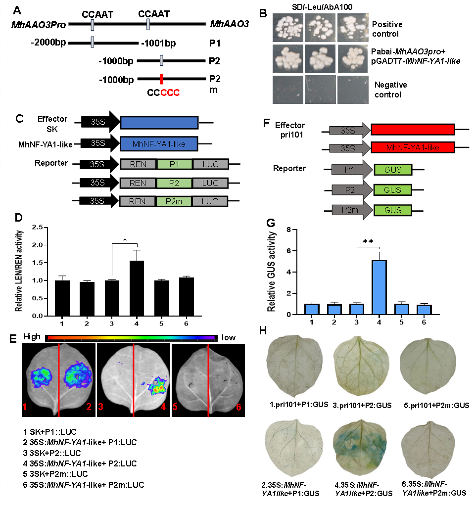 图2 MhNF-YA1-like结合MhAAO3的启动子促进其转录