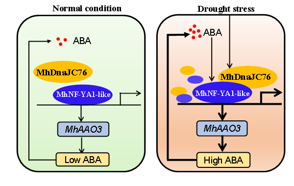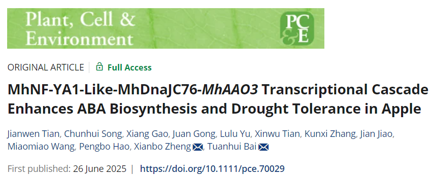 MhAAO3 Transcriptional Cascade Enhances ABA Biosynthesis and Drought Tolerance in Apple”研究论文,该研究发现MhNF-YA1-like与MhDnaJC76蛋白互作促进ABA的积累增强苹果的耐旱性。