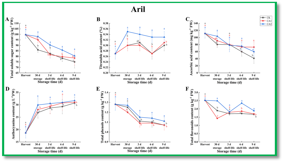 2 (CA2) 两种低温气调贮藏,常规空气为对照,探究鲜食石榴保鲜的营养指标、外观品质、和生理生化变化,通过能量代谢、呼吸速率、ROS清除能力等方面解析了较高的二氧化碳条件(CA2)可以有效降低石榴果实的营养损耗,如,花青素、总黄酮、维生素C等含量,并延长石榴的贮藏期。