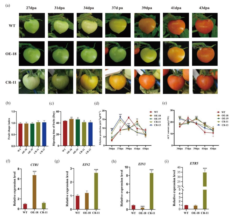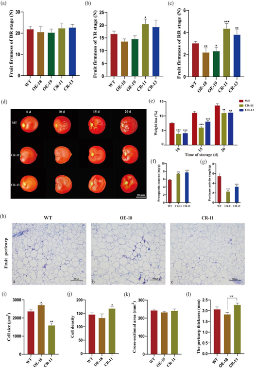 SlEIN4与果实硬度高度相关,同时发现该基因外显子存在1个SNP (A-G)位点(图1)。在低硬度的番茄群体中该位点为(AA),而在高硬度番茄群体中该位点为(GG)。在Micro-Tom番茄中超表达SlEIN4AA(OE),转基因番茄果实成熟延缓,并且果实硬度显著降低。相反,利用CRISPR/Cas9基因编辑SlEIN4AA(CR)后转基因番茄果实成熟提前,并且果实硬度显著升高(图2)。而当在Micro-Tom番茄果实中瞬时超表达SlEIN4GG,转基因番茄果实硬度同样显著提高。这些结果表明SlEIN4在该位点的SNP突变(A-G)对番茄果实硬度具有重要影响。进一步研究发现,SlEIN4在该位点的SNP突变直接影响了番茄果实果皮细胞显微结构。与对照果实相比,OE株系转基因番茄果实表皮细胞更大,而细胞密度较低;相反,CR株系转基因番茄果实表皮细胞变小,并且细胞密度显著高于对照。同时,常温贮藏条件下CR转基因番茄比对照番茄果实更耐贮藏。研究还发现SlEIN4通过影响乙烯信号转导及乙烯应答相关基因表达负调控番茄果实成熟。本研究首次发现了乙烯受体基因直接调控果实硬度的证据,这一发现将为番茄果实硬度、成熟以及贮运性等重要性状改良提供重要理论参考。