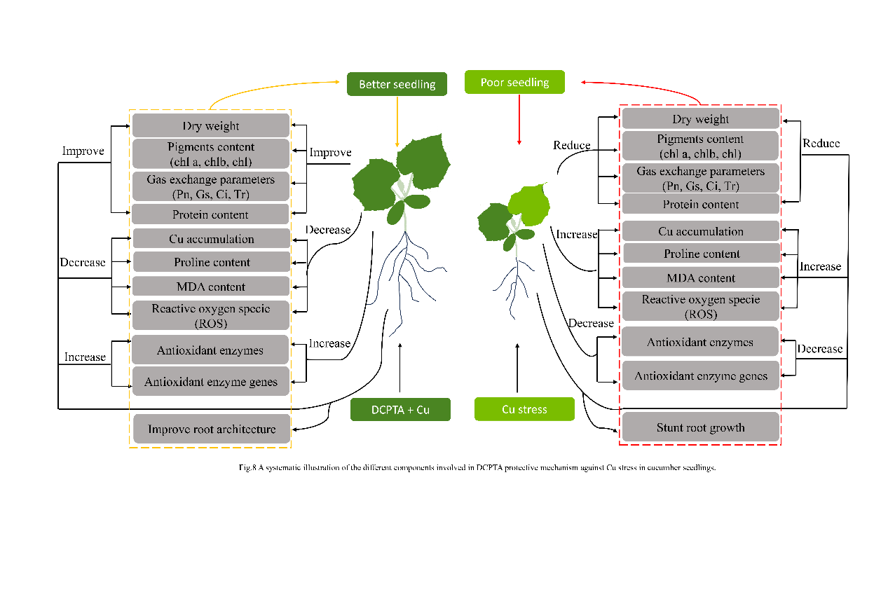 该研究首次阐明了DCPTA在提高作物对重金属胁迫中的作用机制,建立了基于外源DCPTA的精准调控技术体系,缓解了日益严重的设施土壤铜元素超标污染的问题。相关成果为设施重金属污染土壤黄瓜可持续生产提供了理论支撑和依据,为设施黄瓜栽培管理提供了新的思路。
