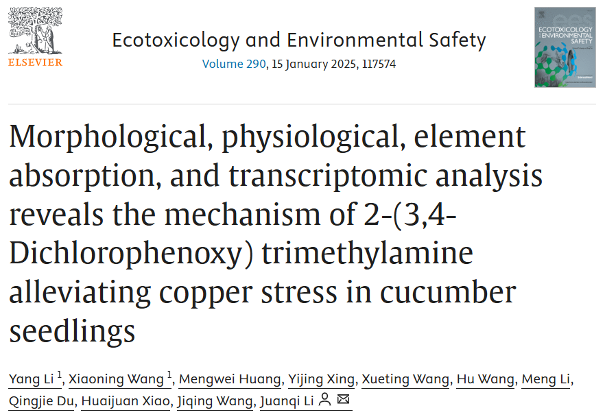 设施蔬菜栽培科技创新团队在Ecotoxicology and Environmental Safety发表了题为“Morphological, physiological, element absorption, and transcriptomic analysis reveals the mechanism of 2-(3,4-Dichlorophenoxy) trimethylamine alleviating copper stress in cucumber seedlings”的研究论文。该研究成果首次系统揭示了外源2-(3,4-二氯苯氧基)三乙胺(DCPTA)提高黄瓜对重金属铜胁迫的调控机制,明确了适用于黄瓜的外源DCPTA的施用浓度,为缓解土壤重金属铜胁迫下的黄瓜栽培提供了创新性的解决方案,对提升黄瓜逆境适应能力、保障设施黄瓜生产具有重要应用价值。