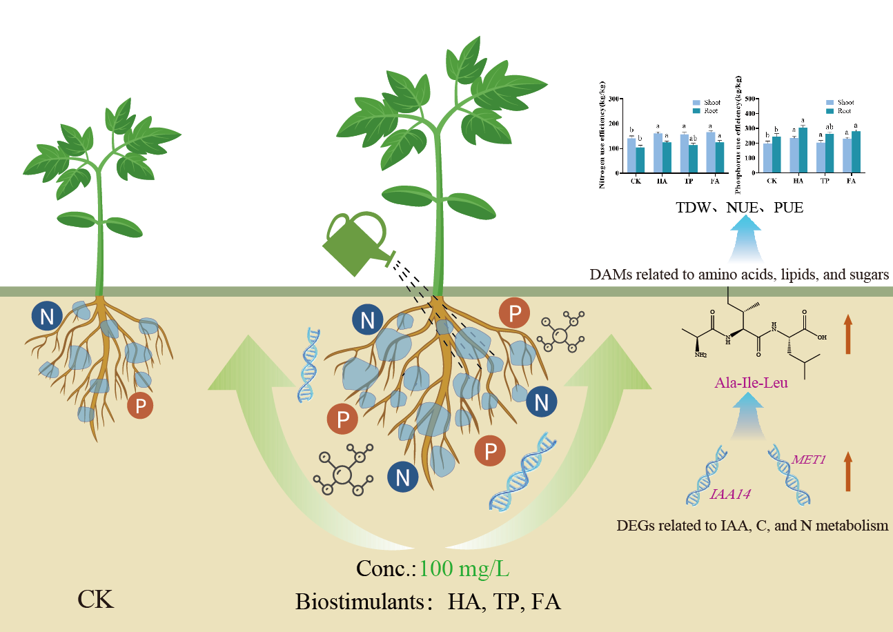 结果表明,HA、TP和FA在元素组成和分子结构上具有相似性和特异性。这些生物刺激素显著上调了番茄幼苗中与IAA生物合成、C、N代谢以及病原体互作相关基因的表达,并提高了氨基酸、脂质、维生素和糖类相关代谢物含量,从而促进了番茄幼苗生长,并提高了N、P的利用效率。且FA处理中这些相关基因表达和代谢物含量明显高于HA和TP处理。Mantel-test分析表明,富含羟基和羧基(具有高 O/C 或(O + H)/C 比)的小分子物质更有利于促进 IAA 、N代谢和糖类代谢物的生成,增加番茄幼苗生物量并提高N、P的利用效率。此外,对于植物生长和养分利用而言,活性官能基团比分子量更为重要。TP作为一种可行性替代品,在促进作物生长方面展现出与腐殖酸相似的潜力,进一步加深了我们对这些复杂大分子中分子结构与功能之间复杂关系的理解。