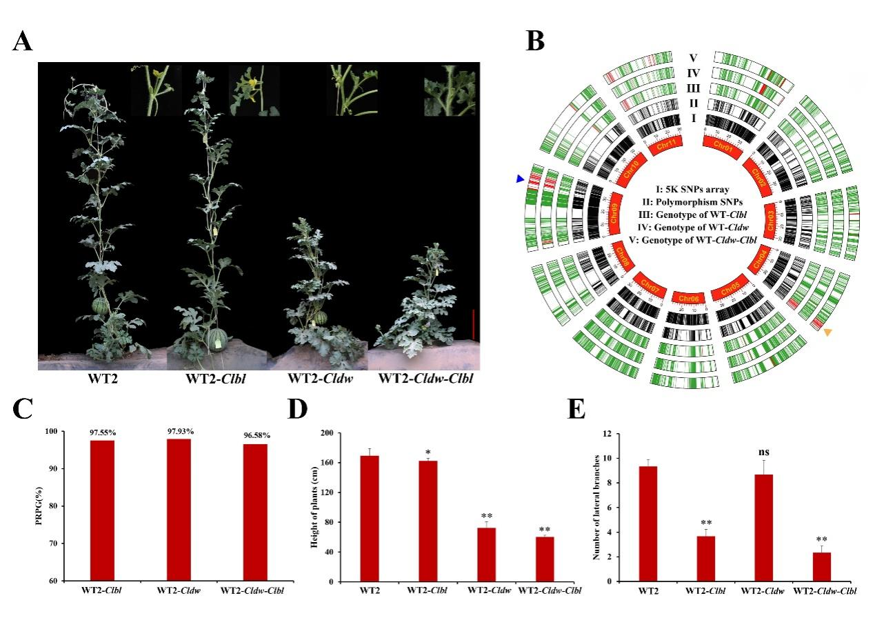 (3)利用课题组开发的和少侧枝基因Clbl和短蔓Cldw共分离的分子标记进行前景选择,并结合西瓜液相芯片进行背景选择。通过两代回交和一代自交,成功将骨干育种材料WT2改良为三种与株型相关的新西瓜种质资源,包括少侧枝(WT2-Clbl)、短蔓(WT2-Cldw1)和短蔓少侧枝(WT1-Cldw1-Clbl)。这些新种质资源的背景恢复率均超过96%,为西瓜株型改良提供了重要的种质资源。