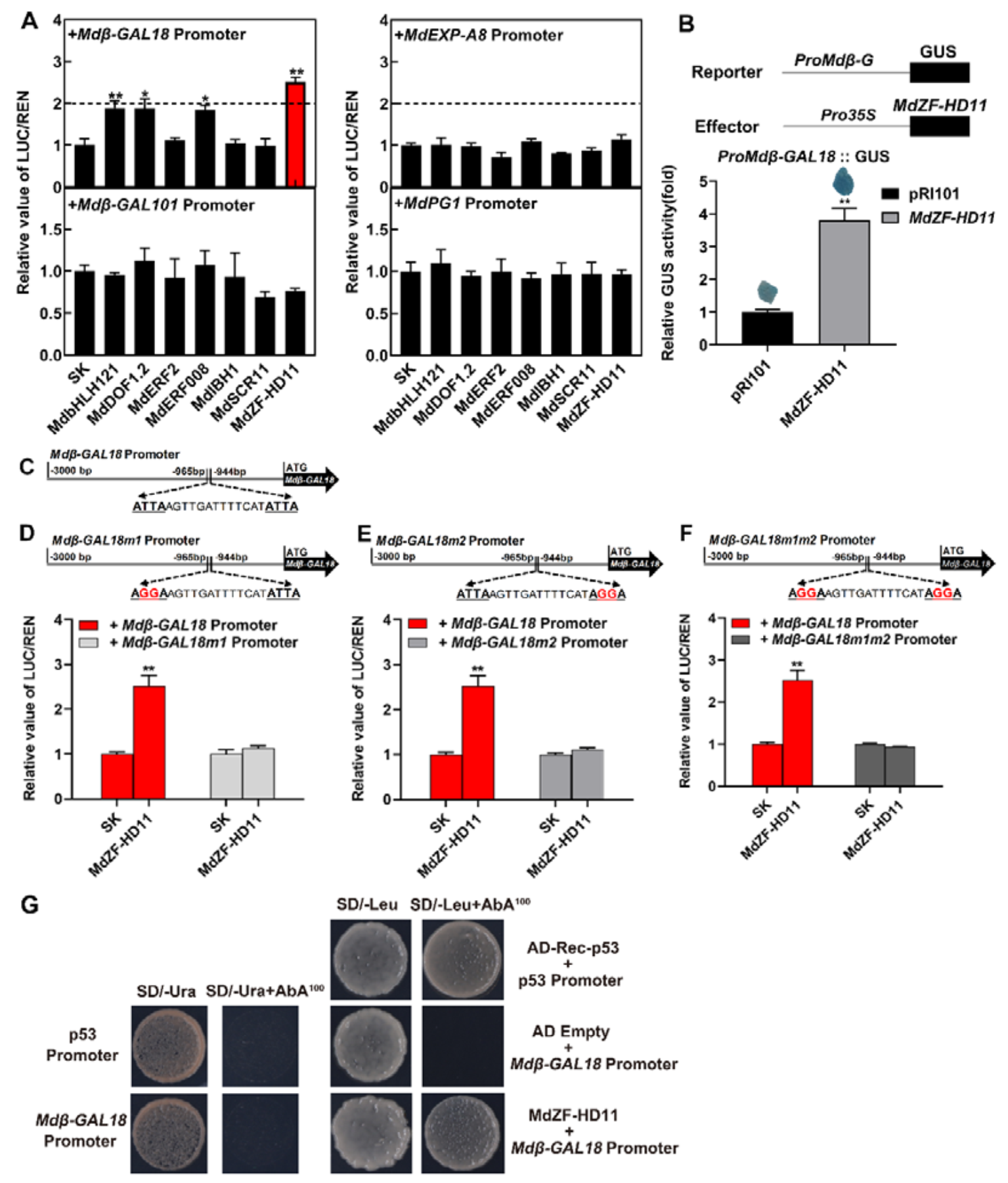 图1 MdZF-HD11结合并促进Mdβ-GAL18基因表达
