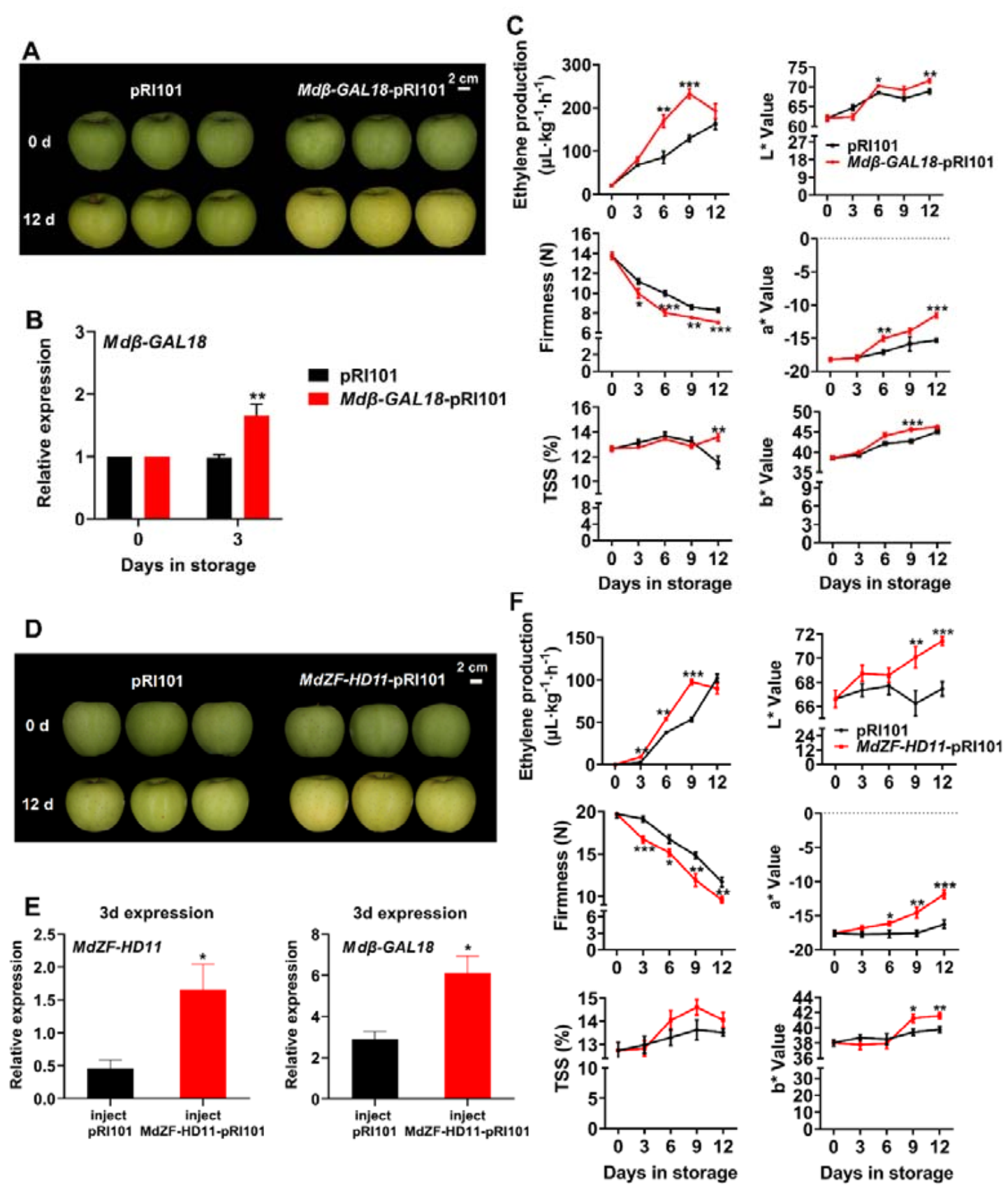 图2 过表达Mdβ-GAL18和MdZF-HD11均能够促进金冠果实的成熟软化