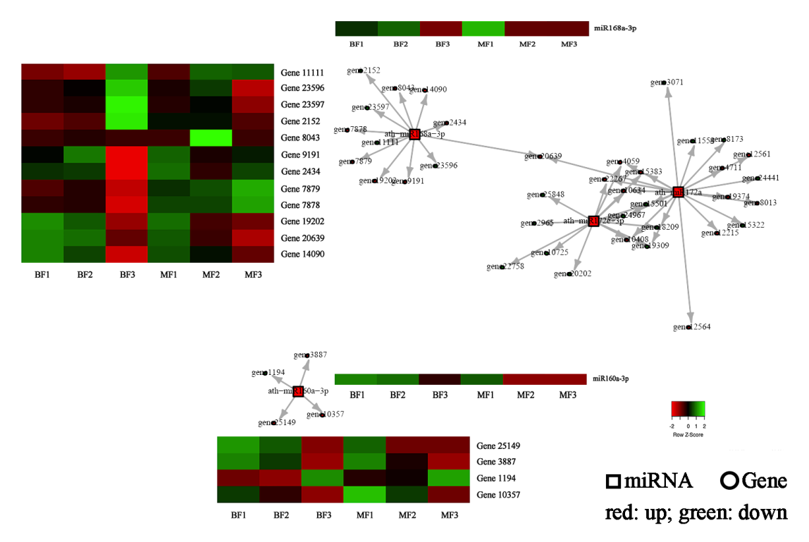图1 差异表达miRNAs与靶向基因关系分析