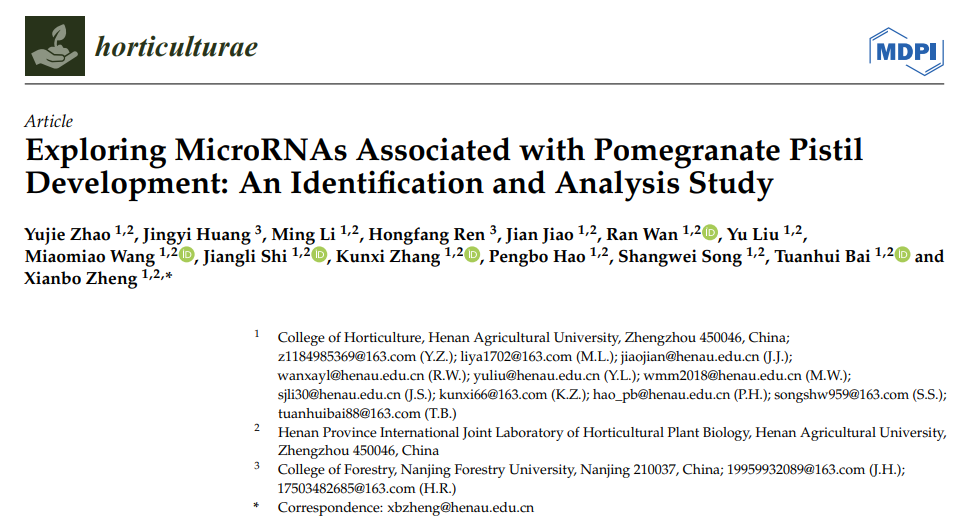 Horticulturae在线发表了题为“Exploring MicroRNAs Associated with Pomegranate Pistil Development: An Identification and Analysis Study”的研究论文,挖掘石榴胚珠发育过程中差异表达miRNAs,为在转录后调控水平上探究石榴胚珠发育机制研究奠定基础。