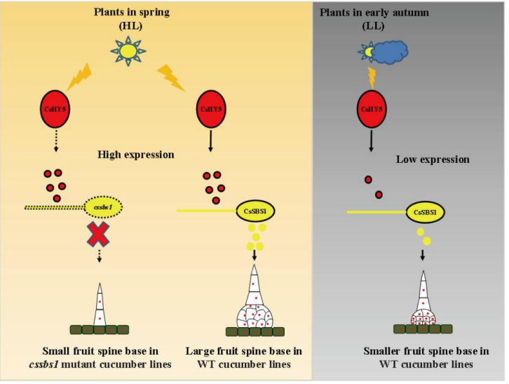 ELONGATED HYPOTCOTYL5 and SPINE BASE SIZE1 together mediate light-regulated spine expansion in cucumber”的研究论文。该研究揭示了黄瓜转录因子HY5和SBS1介导光信号调控果刺大小的新机制。