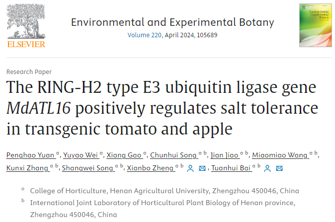 MdATL16 positively regulates salt tolerance in transgenic tomato and apple”的研究论文, 揭示了E3泛素连接酶基因