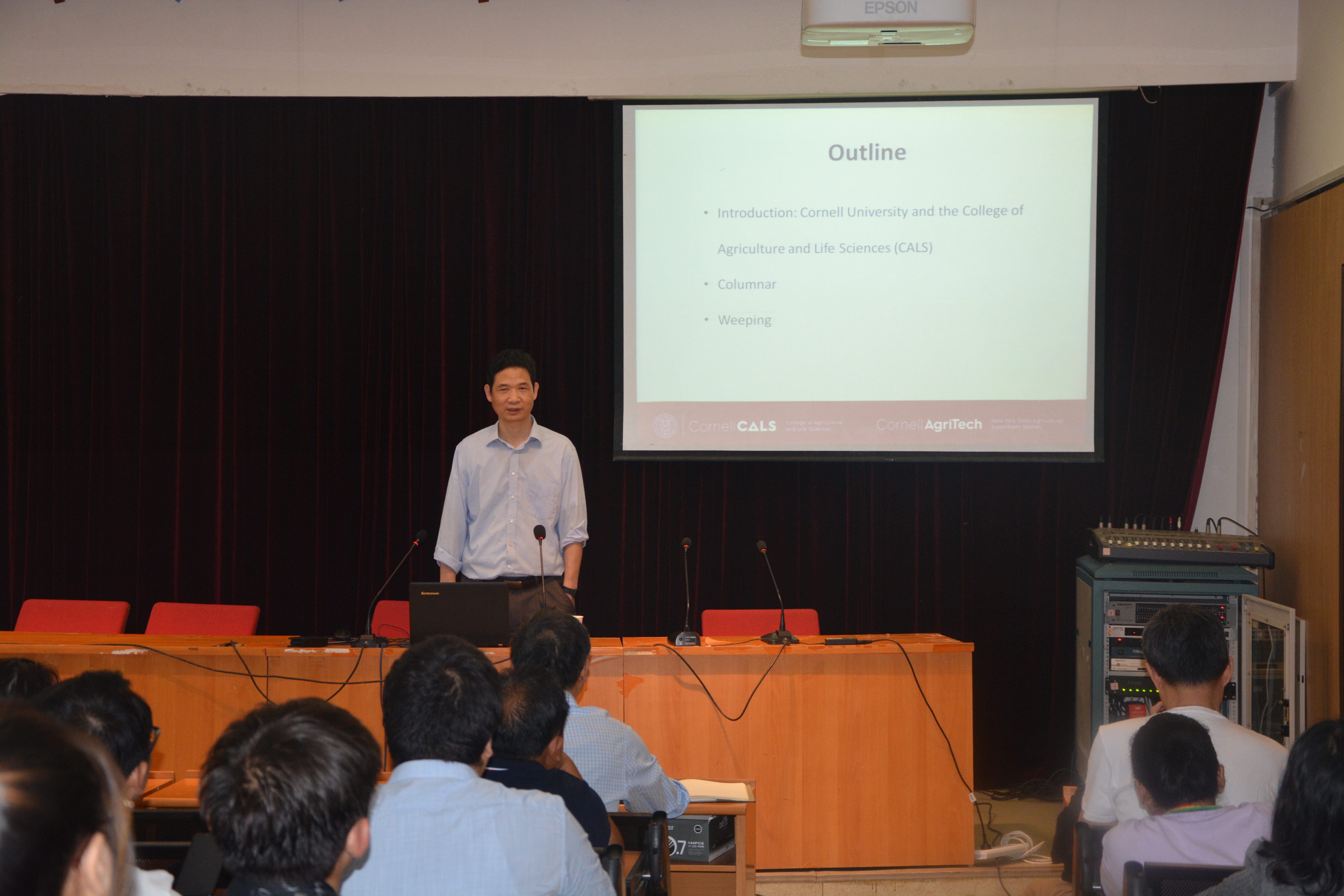 报告会上,许克农博士首先介绍了康奈尔大学和园艺系的基本情况,之后详细介绍了柱型苹果和垂枝型苹果形成的分子机制研究进展,主要利用基因组学和分子生物学手段发现调控苹果树形的基因,并对相关基因进行功能验证。报告结束后,许克农博士与澳门银河娱乐城
