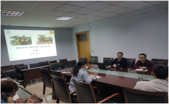 本次报告会是由王伟博士以“甜橙多胺分解代谢与逆境应答”为题作专题报告。王伟博士首先以甜橙的亲缘关系入题,并带大家简单的了解了在逆境胁迫方面的相关内容以及柑橘在多胺参与下的胁迫应答,使大家对本次报告内容有了基础的理解。接着,王伟博士就其在博士期间的研究展开了详细的讲解,从得到的6个基因中选择了一个不包含内含子的CsPAO4基因,通过将基因转入烟草中,并在不同的处理下对精胺、亚精胺及辅胺的含量进行测定分析,证实了这个基因参与了精胺与亚精胺的分解,证明了基因CsPAO4在盐胁迫下的产物H2O2会造成氧化损伤,并且提出将参与多胺末端分解代谢的PAO基因表达下调可能是提高盐胁迫耐受性的方法之一。