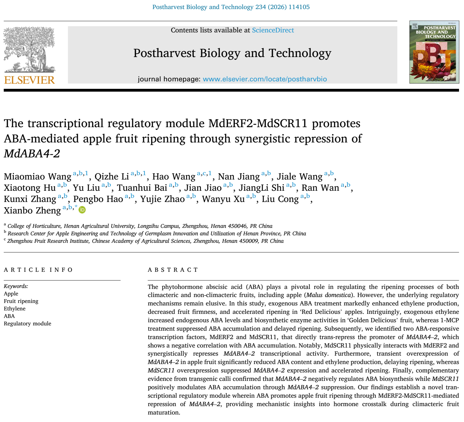 苹果创新研究团队在Postharvest Biology and Technology(中科院一区Top)期刊上发表了题为“The transcriptional regulatory module MdERF2-MdSCR11 promotes ABA-mediated apple fruit ripening through synergistic repression of