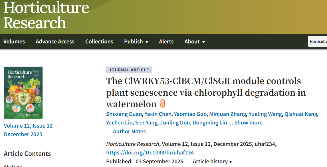 瓜类种质遗传改良与分子育种课题组在Horticultural Research(中科院1区Top,IF=8.5)发表了题为“The ClWRKY53-ClBCM/ClSGR module controls plant senescence via chlorophyll degradation in watermelon”的研究论文。该研究克隆了首个西瓜衰老调控基因,并系统解析了其分子调控网络,显著增进了对西瓜衰老调控网络的理解。