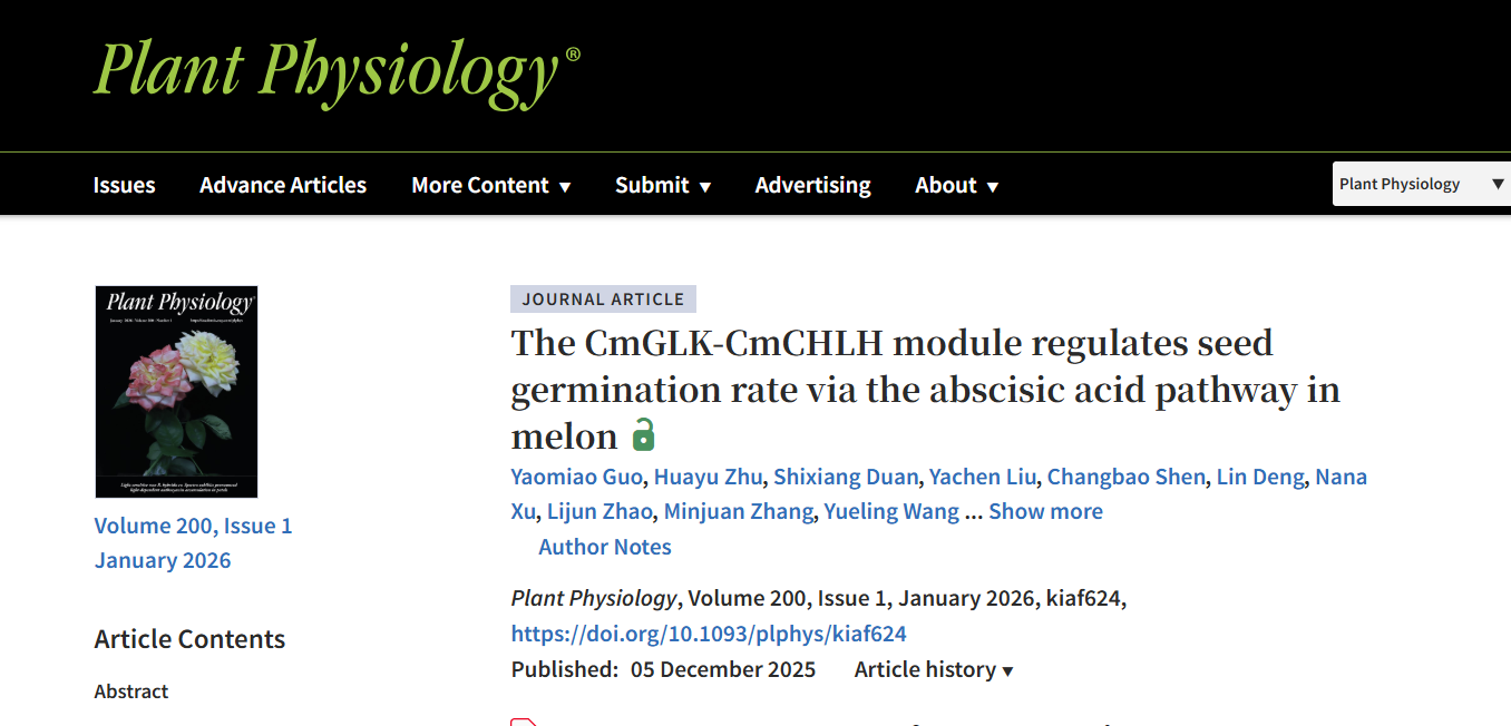 瓜类种质遗传改良与分子育种团队在国际著名期刊Plant Physiology(中科院一区Top)发表了题为“The CmGLK-CmCHLH module regulates seed germination rate via the abscisic acid pathway in melon”研究论文,该研究发现叶绿体发育相关的转录因子Golden2-like能决定发芽“起跑速度”。