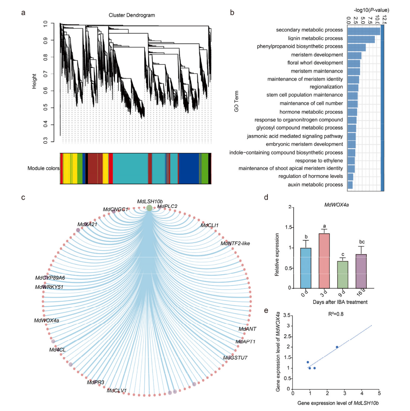 研究团队进一步通过转录组分析和实时荧光定量PCR技术,发现MdLSH10b在不定根诱导阶段(IBA处理后第3天)表达量显著上调。加权基因共表达网络分析(WGCNA)显示,MdLSH10b与包括MdWOX4a在内的126个基因存在紧密共表达关系,这些基因显著富集于分生组织发育、细胞数量维持和激素代谢等生物学过程。通过酵母单杂交(Y1H)和GUS活性分析,研究团队证实MdLSH10b能够直接结合MdWOX4a的启动子并转录激活其表达。