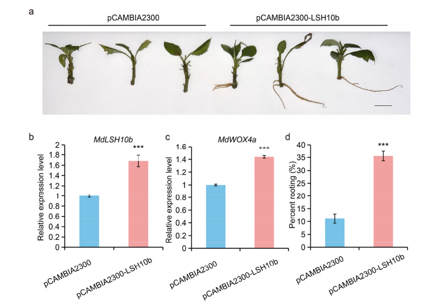 更为重要的是,瞬时过表达MdLSH10b的苹果植株不定根诱导率显著提高了约3倍,从对照组的11%提升至35%。该研究将LSH转录因子与苹果不定根形成联系起来,揭示了"MdLSH10b-MdWOX4a"这一全新的调控模块在不定根发育中的正调控作用。这一发现不仅丰富了我们对木本植物根系发育分子机制的认识,也为通过分子育种手段改良苹果砧木生根能力提供了重要的基因资源和理论支撑。