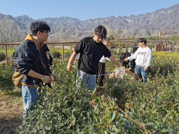 上午,抵达济源卢仝茶园。在茶园中,贺巍、张芬老师为大家讲解了茶叶的生长特性、栽培管理要点等基础知识。随后,在老师的专业指导下,学生分组对茶树的树冠结构、叶片形态及分枝规律进行了实地测量与数据记录。这不仅锻炼了同学们的动手操作能力,更让大家对茶叶的植物学特征和优质茶叶的种植标准有了具象化的认识。